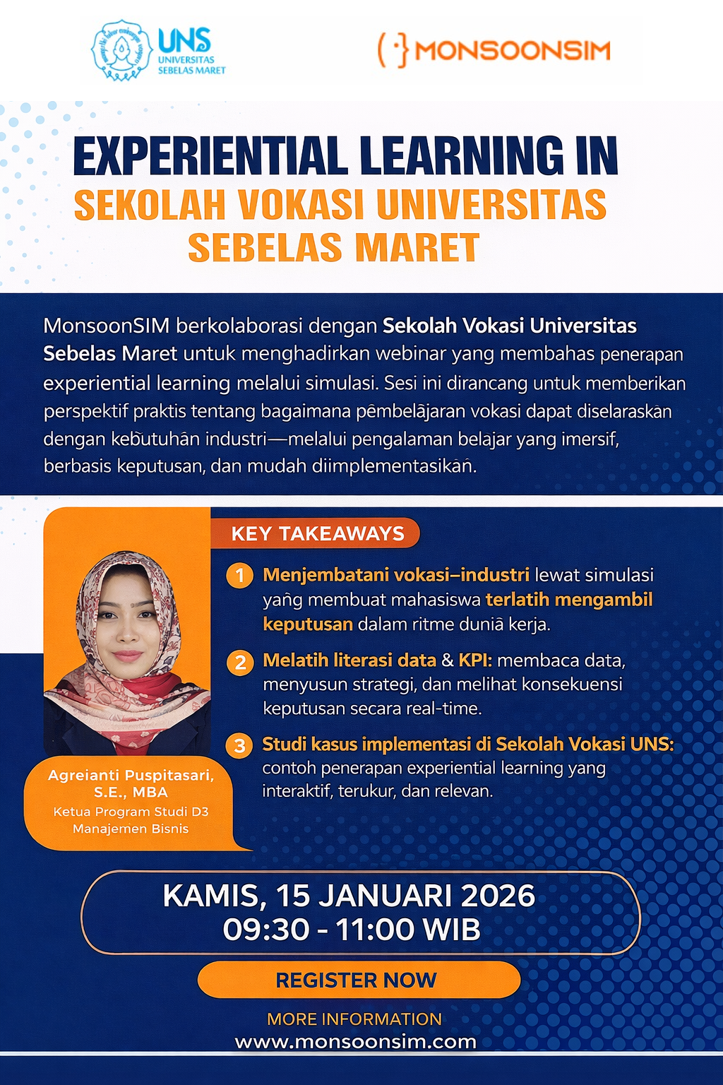 Di Era abad 21 merupakan tantangan bagi para pendidik bagaimana menyampaikan pembelajaran yang berkualitas demikian juga Sekolah vokasi dituntut menghasilkan lulusan yang tidak hanya paham konsep, tetapi juga terlatih mengambil keputusan, membaca data, dan bekerja dalam ritme industri. Melalui webinar ini MonsoonSIM bersama Sekolah Vokasi Universitas Sebelas Maret akan membahas bagaimana simulasi dapat menjadi jembatan antara pembelajaran di kelas dan praktik di dunia kerja—secara interaktif, terukur, dan relevan. Dalam sesi ini, Ibu Agreianti Puspitasari, S.E., MBA (Ketua Prodi D3 Manajemen Bisnis – Sekolah Vokasi UNS) akan membagikan praktik penerapan pembelajaran berbasis pengalaman melalui simulasi—bagaimana menghubungkan kelas dengan dunia kerja secara interaktif, terukur, dan relevan.