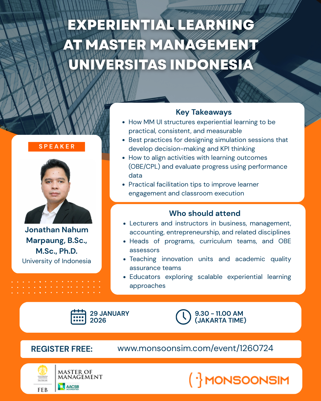 Join this guest session to explore how experiential learning is implemented at the Master Management, University of Indonesia (MM UI), with practical insights you can replicate in your own classroom. This session is designed for educators, program leaders, and curriculum teams who want to strengthen student decision-making, engagement, and measurable learning outcomes through simulation-based learning.